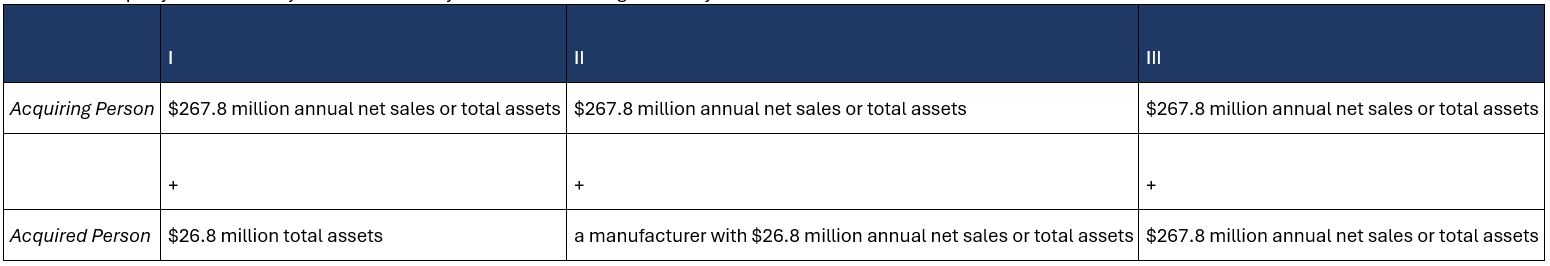The size of party threshold is inapplicable if the value of the transaction exceeds $535.5 million (up from $505.8 million in 2025). As for transactions valued between $133.9 million and $535.5 million, the size of the party threshold may be satisfied in any one of the following three ways: